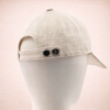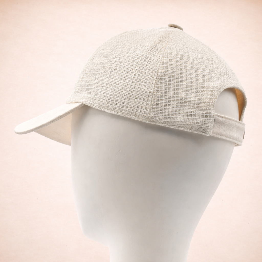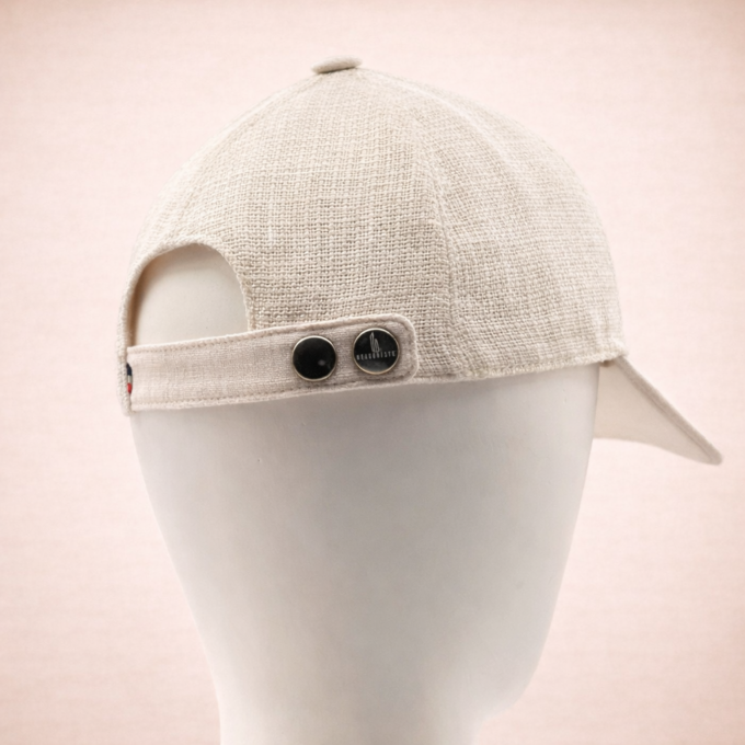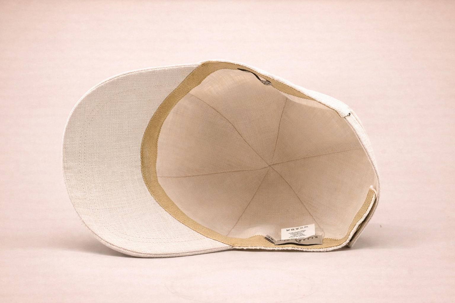 Cette casquette unique est fabriquée à partir d’ un tissu en coton ajouré crème . Sa visiere  en lin uni souligne l’originalité de ce modèle.