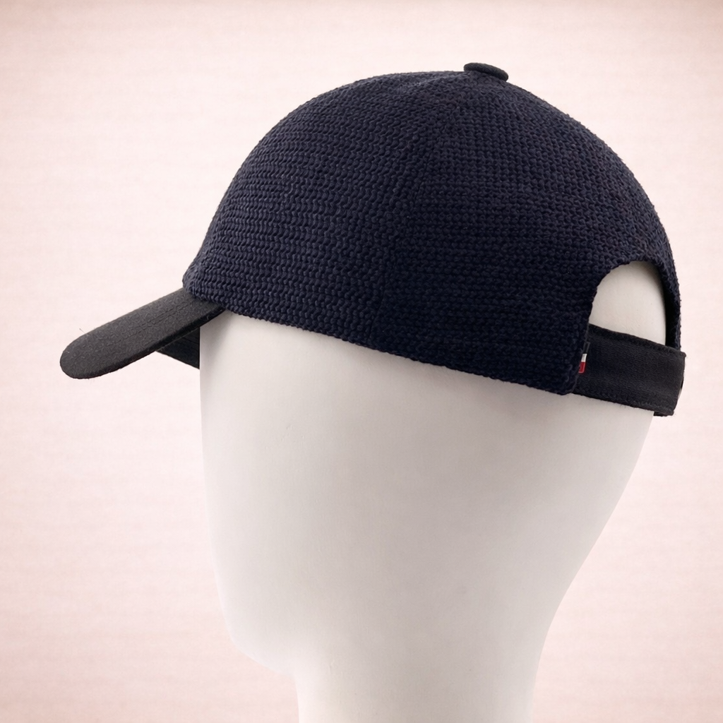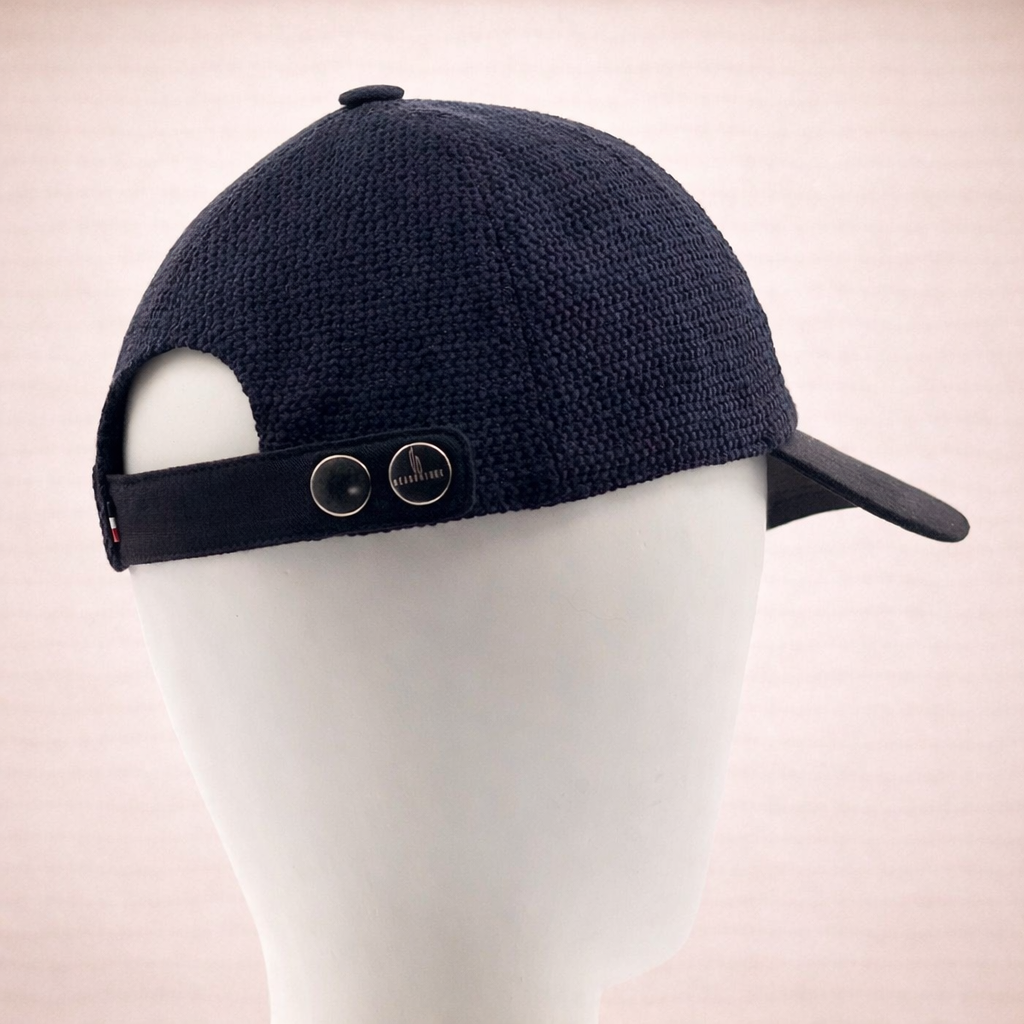 Cette casquette unique est fabriquée à partir d’ un tissu en coton ajouré noir . Sa visiere  en coton uni souligne l’originalité de ce modèle.