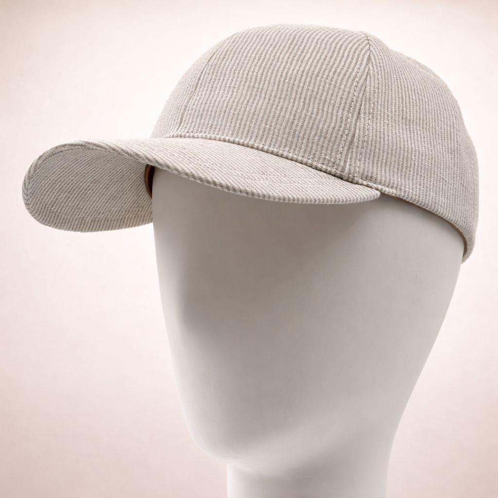 L’élégance  française en tête avec cette casquette en lin rayure bicolore oshkosh  coloris camel/ecru. Un must have pour cet été.